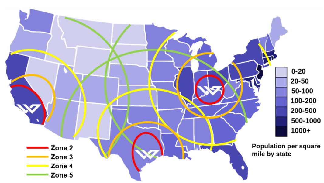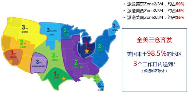 如果你在美国有三个仓库,基本上可以在理想的状态下三天内进行全美的妥投,比例是达到98.5%,当然偏远地区除外。