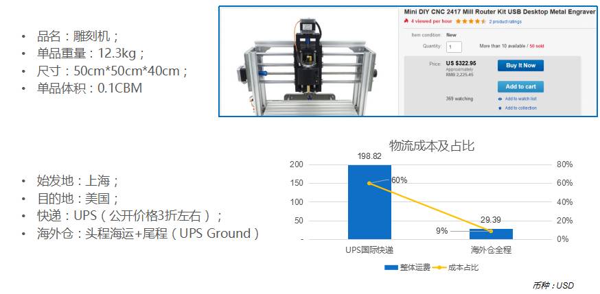 这来自浙江的雕刻机,发到美国,老美是很喜欢自己在车库里面DIY一些东西,所以这个东西大家看起来好像家庭不可能有,但是在老美眼里就是在车库里的一个小玩具。这个可以销售到322.96美金,还是一个比较高单价的产品,达到了0.1个方。这个已经超过了小包可以接受的重量范围,然后单件体积也很大,所以发专线也不合适,发快递也有人发。前面那件冲锋衣用空运,这个东西我们发海运会更加划算。从而我们可以看到将近200美金的快递费用,但是如果你使用海外仓的话,你可以把整体的费用将降低到接近30美金,整体不含税金的物流成本不到10%。