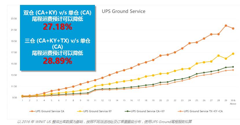 在成本上,用整个2016年出库的数据来做了一个测算,也就是这些订单都放到美国的西岸去发或者是分散在西岸和东岸发,或者分散在三个仓发,也就是根据刚才的分区放到组合式的地方发,在成本上的状况,我们可以看到最上面的这条深色的橙色的线就是单独发的,黄色单独从东岸仓发,绿色是西岸仓、东岸仓最优势的仓发,可以看到整个对于成本的下降是可以达到近三成,也就是使用两个仓最优的派送范围去派送订单也可以下降成本的比例。三仓可以再进一步地提高两个点。