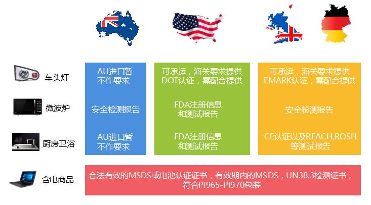 以几个产品为例,在不同的国家,比如说像车灯,澳大利亚对进口暂时不做要求,但是安全检测报告还是需要的;微波炉,在厨房卫浴澳大利亚也不做要求,运到美国海关需要提供DOT,美国交通部自愿的认证。但是如果你的货被查出来不符合,你会被罚得很惨。像微波炉这种产品是需要FBA的注册信息和报告,这个就需要但是在工厂采购的时候要注意的。要么就是要求你的工厂提供这样的信息给你,要么就是你和工厂联合去做一些定制产品的在国内的认证。厨房卫浴产品在美国进口也是需要的。