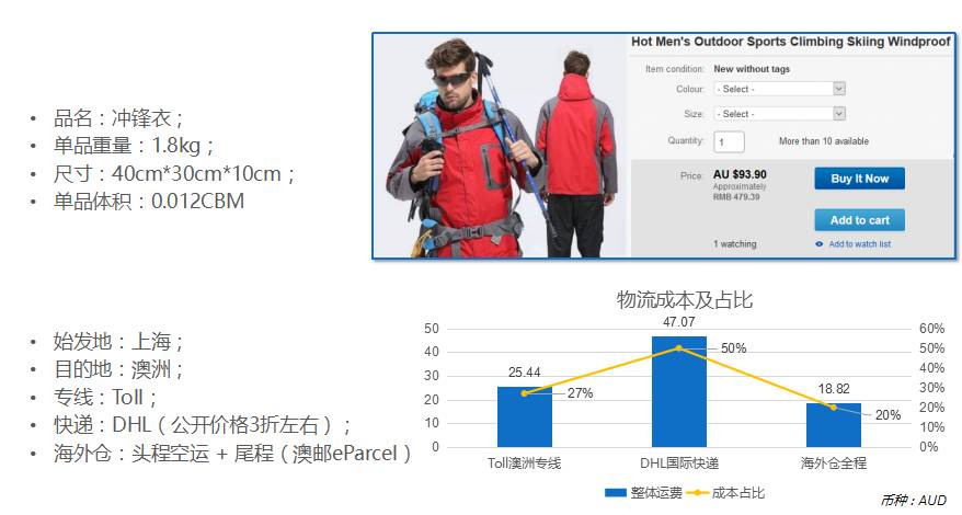 比如说这样的一个冲锋衣,售价是93.9澳币。我们可以看到整体的重量,单品的尺寸、体积。如果从上海去澳洲,可以看到在整体的费用上海外仓的费用是18.82澳币,而专线是25.44澳币,DHL可能需要达到47.07澳币,这个是整体的运费。所以在整个售价里面,物流的占比,可以发现海外仓也是比较低的,当然这个东西是1.8公斤重,从大数据看基本上在300克—400克左右,海外仓整体发货成本就会有一个很明显的下降。所以在这1.8公斤的冲锋衣非常适合做海外仓帮助大家提高发货速度和效率,以及赚取更多的利润。