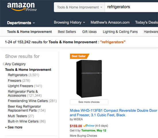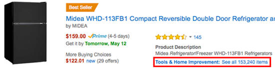 这样有何影响?如果你在亚马逊上卖冰箱,那就要注意了,知道最畅销的冰箱的归类很重要,如果你的冰箱主要分类为“Appliances”,那如果消费者在“Tools & Home Improvement”下搜索冰箱,搜索结果里就完全不会出现你的产品了。