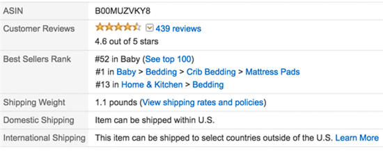 不过亚马逊影响sales rank排名的指标有很多,产品归类也有影响。比如下图所示,American Baby的婴儿床垫在baby类别排名52,但在baby子类目下的“bedding”却排名第一。