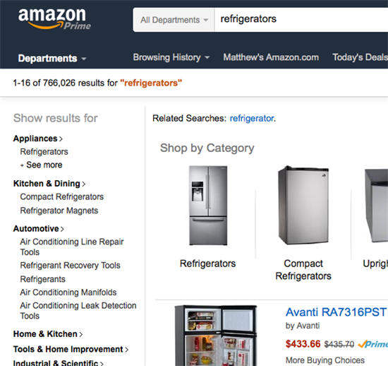 在搜索结果中可以看到,冰箱的listing有很多分类(见上图左侧)。