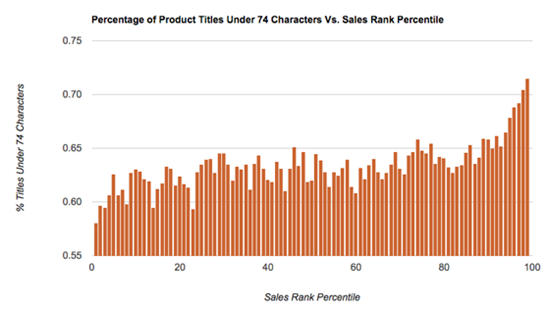 如下图所示,简短的标题和sales rank有很强的关联性,即产品标题字符在74个以下销路更好。
