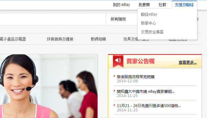 第一步:登录www.ebay.com.hk ,然后点击页面右上角的“支援与联络”