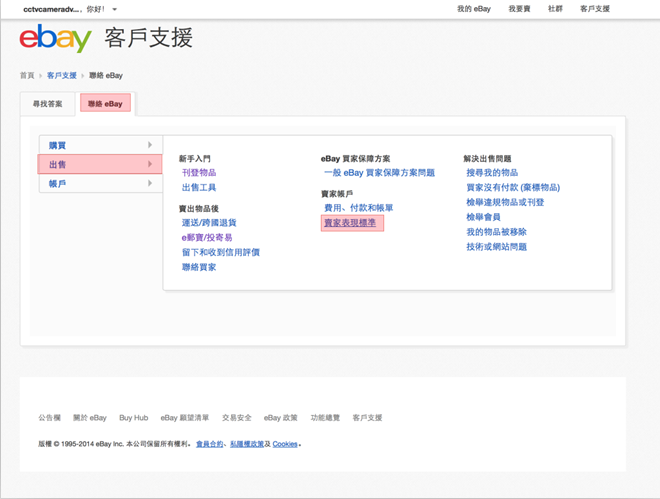 第二步:点击【联络eBay】选择【出售】,随便选择一项,以【卖家表现标准为例】