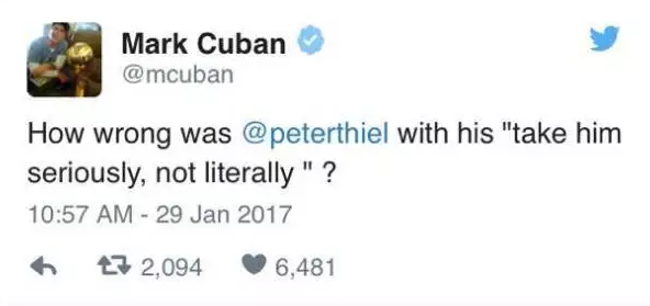 令彼得·蒂尔也没想到的是,特朗普入主白宫后,不但seriously而且还literally。他曾经给选民做出的各种承诺,不光是认真的而且居然还一条一条的挨个实行,言出必行令很多人始料不及。比如登基第一周就发布了7个穆斯林国家公民的禁入令。特朗普这种既“serioulsy”又”literally“的做法让彼得·蒂尔大为尴尬。最有趣的是,不少美国民众跑到twitter挤兑彼得·蒂尔,看看下图大家是怎么说的,特别是最后一句话: