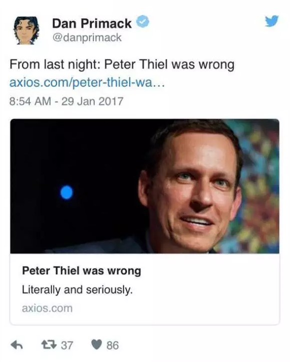 但过去的2016年,彼得·蒂尔最牛x的事迹莫过于在几乎整个美国科技界都不看好甚至反对特朗普的情况下,唯独他压中了特朗普的胜选。