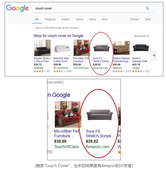 但跨境电商小伙伴们注意到了没有,最近用Google搜产品,Amazon也出现在了Google的广告位上。Amazon也开始买Google Product Listing Ads(PLAs)了!