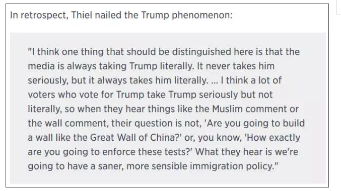 竞选期间,彼得·蒂尔对于特朗普的支持者和反对者曾经有一过一个精彩的评论,他说supporters take Trump seriouly but not literally,支持者们不会按照字面意思去解读特朗普,而是透过表象理解到特朗普话语背后的真正用意。比如特朗普说要禁止穆斯林难民入境,他其实只是打个比方,他真正要想说的是美国正面临非常严峻的极端伊斯兰恐怖主义威胁,必须立即着手解决。而特朗普的反对者,特别是被他称为”真正反对党“的媒体则是take Trump literally and never take him seriously(媒体只是片面的从字面去解读特朗普)。