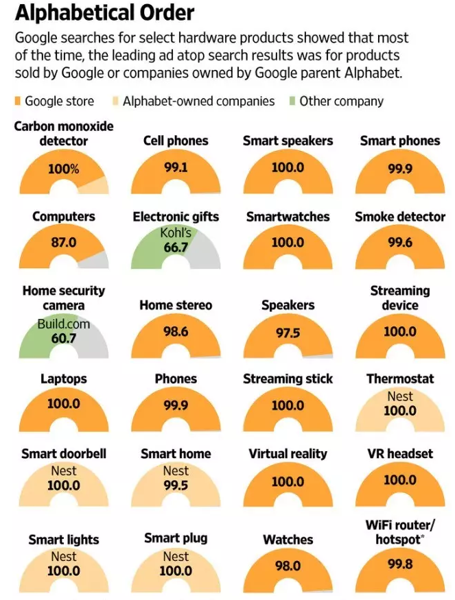 文章5:《Google Uses Its Search Engine to Hawk Its Products》,WSJ, 01/19/2017看到这里,大家可能马上会想到一个问题,Google会不会在搜索结果排名上偏向自己?答案是:Yes。看看下图研究机构做的测试,在Google里搜索“Smartphones",出来的产品结果,前三都是Google Store的链接。