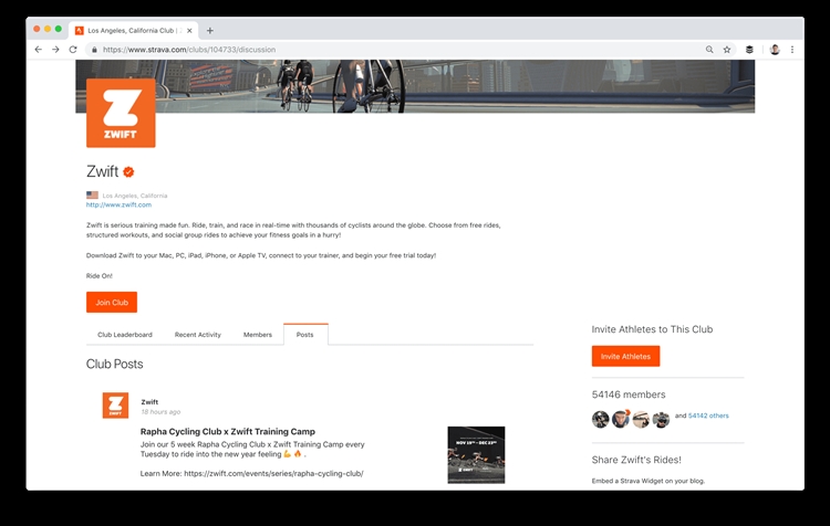 多人在线骑行训练软件公司 Zwift在 Strava上开设了一个俱乐部,这是一个面向运动员的社交网络。他们的俱乐部拥有超过 57,000 名骑自行车的人,数千人在 Strava 上发表了他们的帖子。