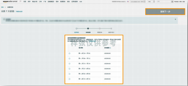 第二步:选定参加7天促销的商品后,通过安排促销页面选择“想要推出促销的时间>继续下一步”选定创建7天促销的时间段;