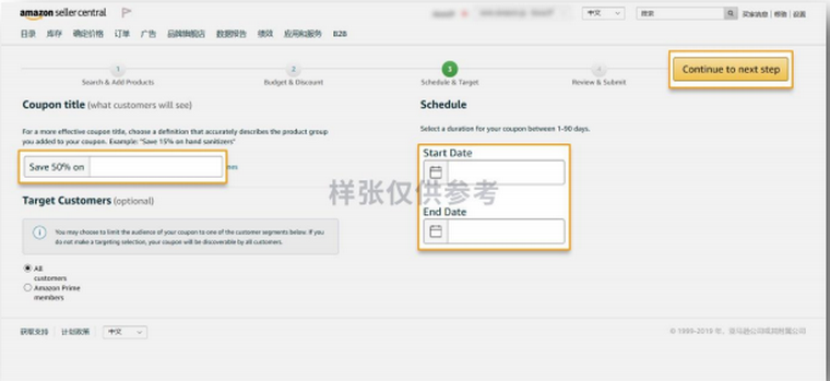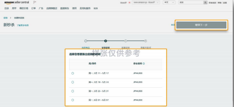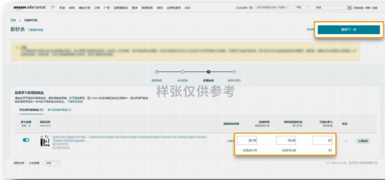 第三步:选定创建秒杀的商品以及时间段后,“输入促销价格>每件商品的折扣>洗择ASIN设为主要商品>继续下一步”设置秒杀参数;