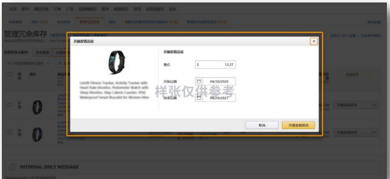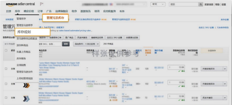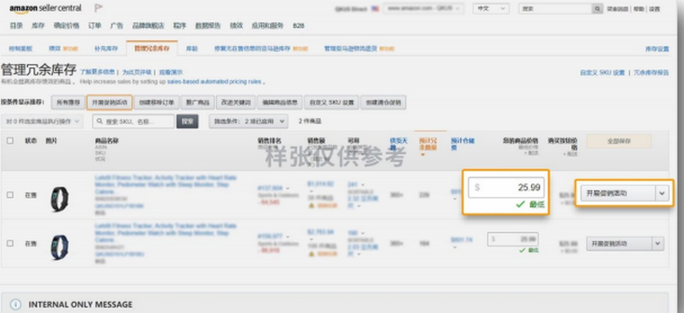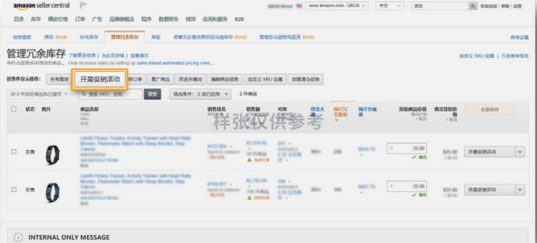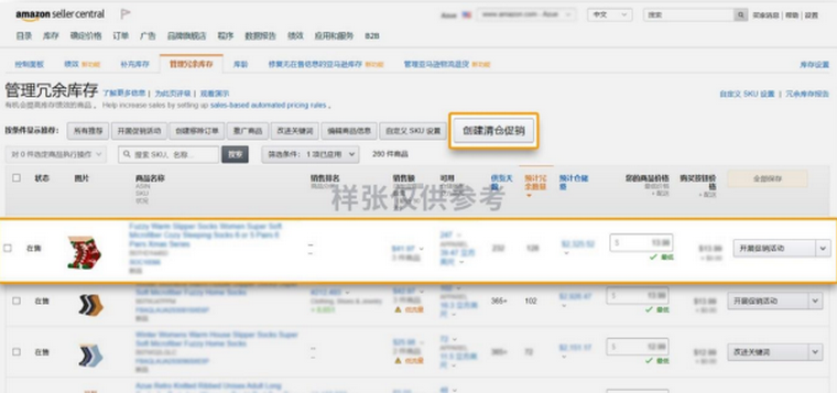 第一步:通过亚马逊卖家平台的库存下拉菜单“库存规划>管理冗余库存>开展促销活动”,查看可创建清仓销售的商品列表;