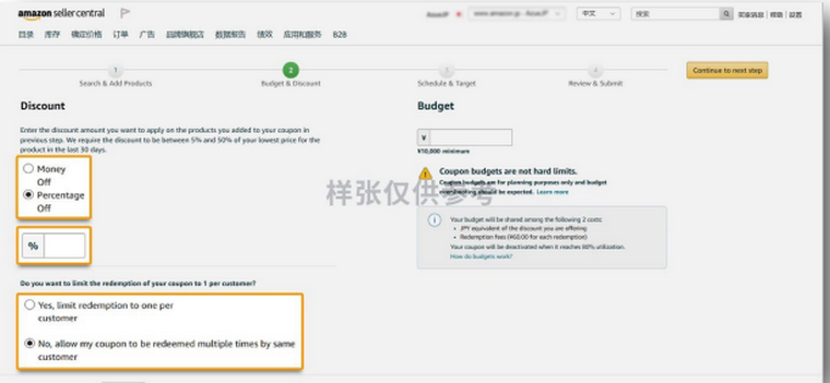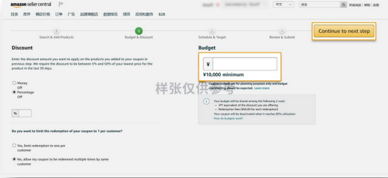 第四步:为优惠券设置预算,并点击“继续下一步”;