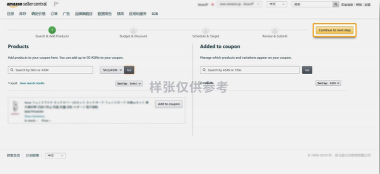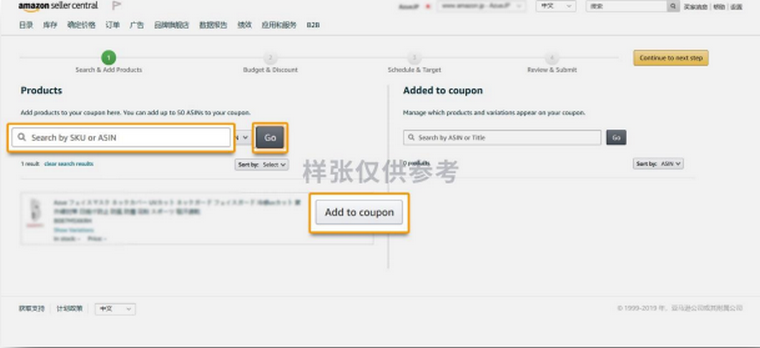 第二步:输入"SKUor ASIN>Go>添加到优惠券>管理变体>继续下一步”选择相关商品;