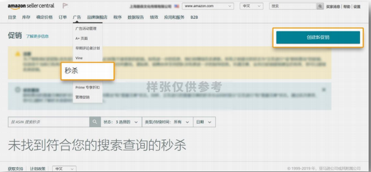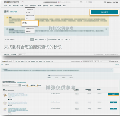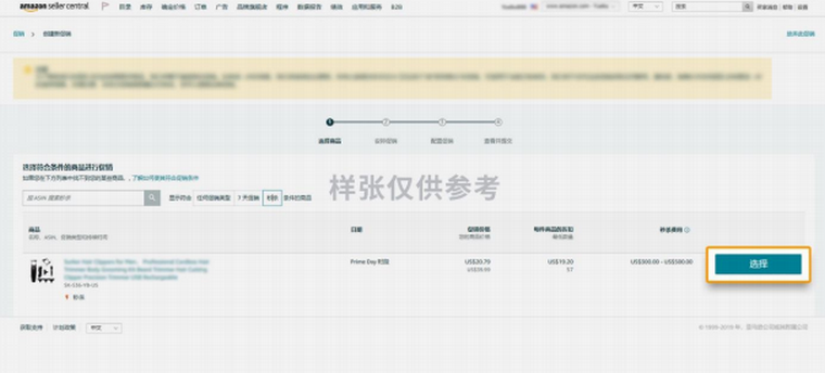 第一步:在“广告”下拉菜单中点击“秒杀>创建新促销> 7天促销"筛选出有7天促销推荐的ASIN>点击“选择”进入设置
