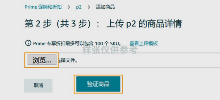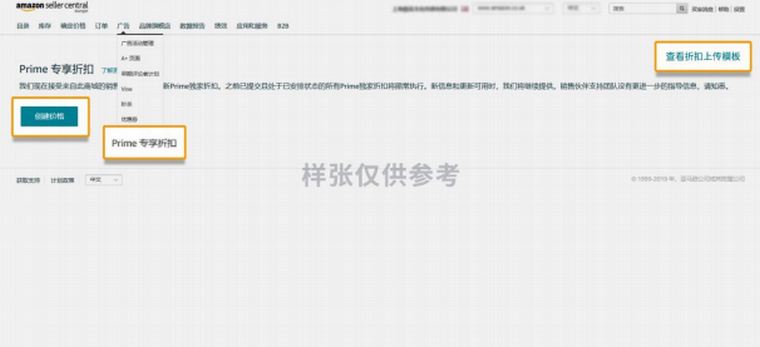 在“广告”下拉菜单中点击“Prime专享折扣>查看折扣上传模板”填写您的商品和定价;