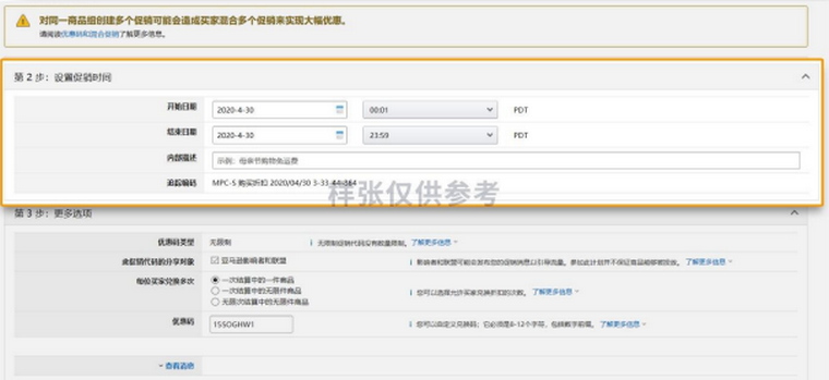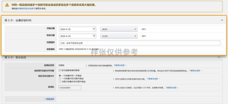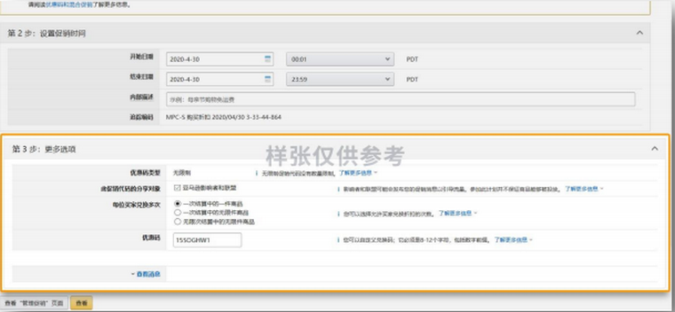 第三步:通过“开始日期>结束日期>内部描述>追踪编码"设置促销时间。同时,您也可选择通过“每位买家兑换多次选项>优惠码"创建商品的专属促销信息;