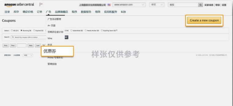 第一步:在“广告”下拉菜单中点击“优惠券>创建新优惠券”查看可创建优惠券的商品列表;