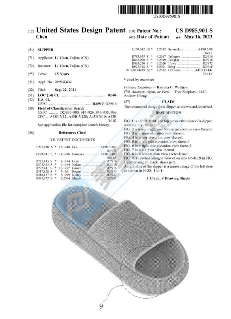 本案是TZZ Law律所9月初代理国人卖家Chen Li发起的一起密封专利维权案件,直至近期才被法院要求修改起诉文件,涉案专利得以曝光!涉案专利为一款号为:D985901拖鞋,于2023年5月16日获得美国外观专利认证。该拖鞋乍一看平平无奇,但在跨境电商平台有数万的销售记录,卖家需注意排查并避雷!从原告修订的起诉文件看,本次仅有7个亚马逊店铺涉案,需要名单的卖家可联系我们获取!