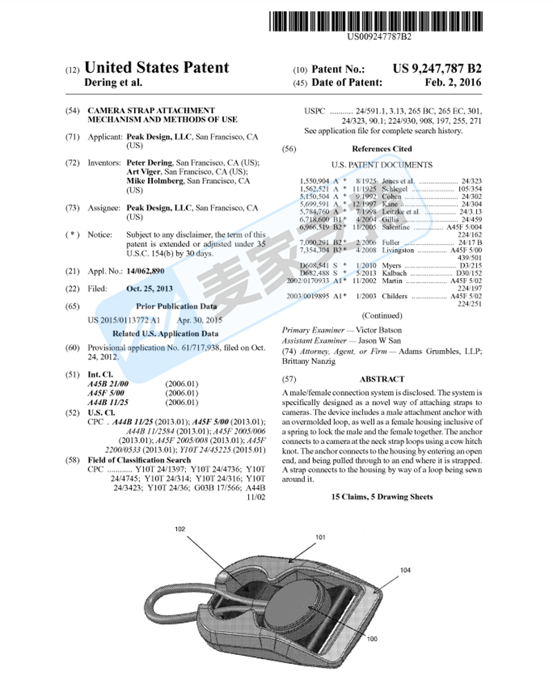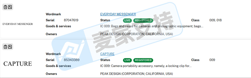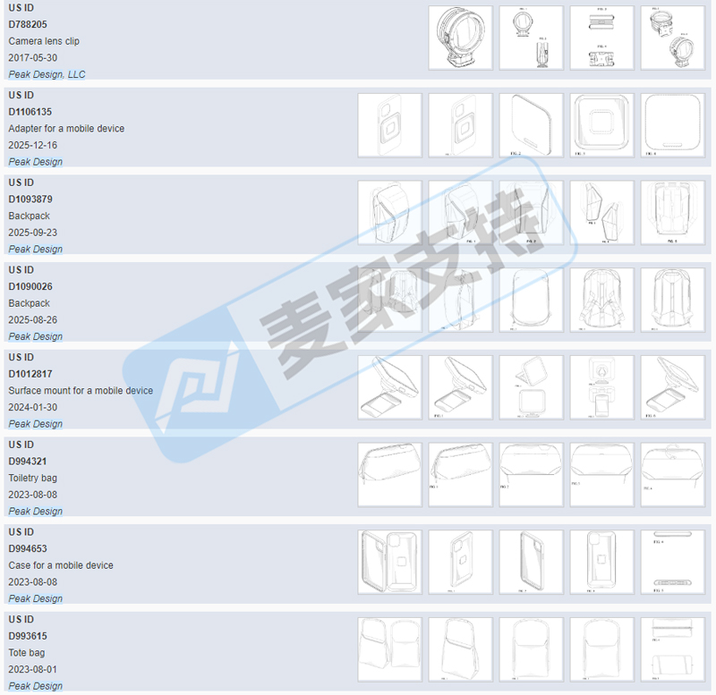 本案是Flener律所11月初代理Peak Design, LLC发起的密封专利维权案件,麦家支持通过搜索发现,Peak Design, LLC在美国仅外观专利就注册有25个,均与相机配件产品相关。除此之外,原告还注册有EVERYDAY MESSENGER和CAPTURE两个文字商标,均注册在第9大类,涵盖相机包袋以及配件领域,跨境卖家需注意规避!