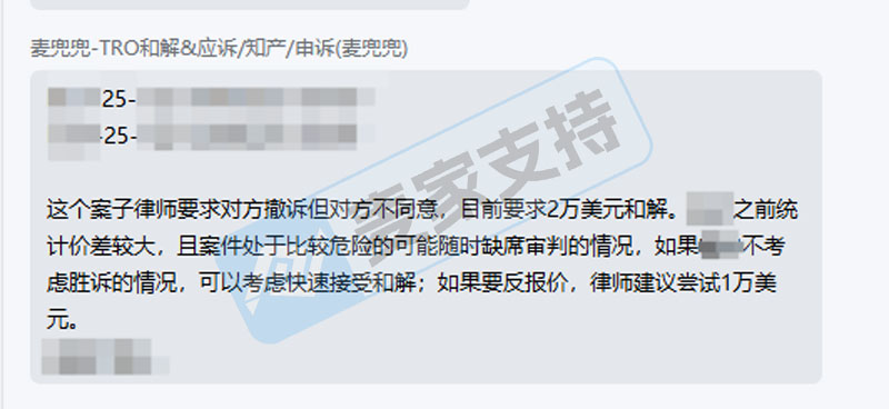 图片来源:麦家支持官网了解到客户的紧急处境后,麦家支持迅速为客户匹配了经验最丰富的美国本土特级律师团队全称加急专项跟进,只为抢在划扣前守住客户的资金。律师团队接手后,第一时间与原告律所取得紧急对接,快速沟通案件核心诉求,最终原告律所表示2万美金的和解不再有让步的空间,我方律师结合案件情况,给客户理性建议:先反报价1万美金,争取快速和解,避免陷入缺席判决的被动局面。客户综合衡量缺席划扣的巨大风险,认为哪怕多花点钱,也想尽快了结,当即告知我们:愿意接受2万美金的报价,只求快速和解,不再冒任何风险。