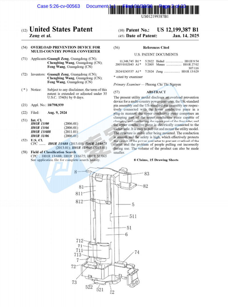 本案是Avek Ip, LLC代理Dongguan Best Travel Electronics Co., Ltd. 在德克萨斯州发起的专利维权案件,涉案专利号:12199387,为一款于2025年1月14日获得美国发明专利的多国电源转换器过载保护装置产品。该专利涵盖产品的设计原理,即使外观存在一定差异,但功能相似也会有可能面临侵权导致TRO冻结的风险,目前该案件处于前期立案阶段,暂未获批TRO临时限制令,有销售相关产品的卖家需尽快排查,并下架高危产品,做好进一步应对措施!