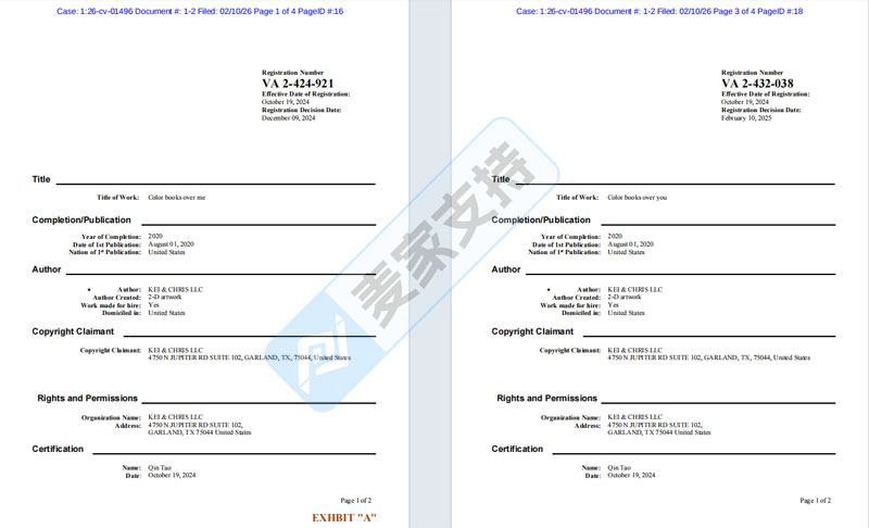 而本次维权的版权号为:VA2-432-038和VA2-424-921的2个彩色书版权作品也曾发起维权高达三次,但由于种种原因,暂未获批TRO临时限制令,本次卷土重来,目标直指50个亚马逊涉案店铺!需要名单的卖家可联系我们进行排查,并做好进一步应对措施!