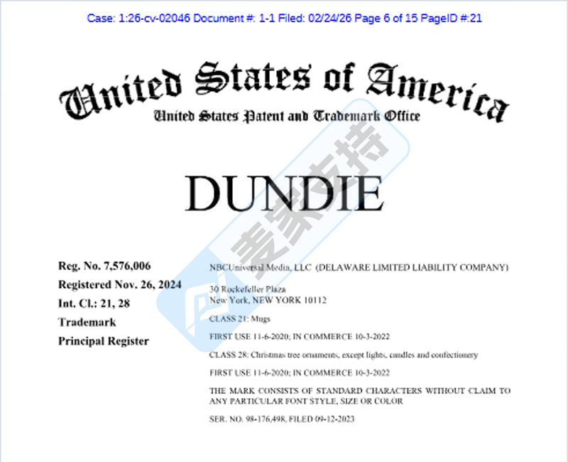 2月23日至24日,GBC律所代理NBCUniversal Media, LLC向伊利诺伊州北区联邦法院提交7起商标维权案件,目标直指跨境平台上未经授权的The Office涵盖的Dunder Mifflin、Dundie以及Schrute farms等3个商标所涉及的周边商品,包括T恤、贴纸、手机壳、马克杯等的侵权行为,目前,7个案件均处于前期立案阶段,暂未获批TRO临时限制令,跨境卖家速排查下架高危链接!