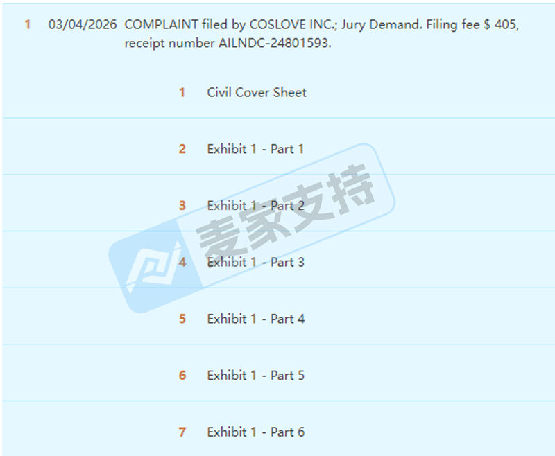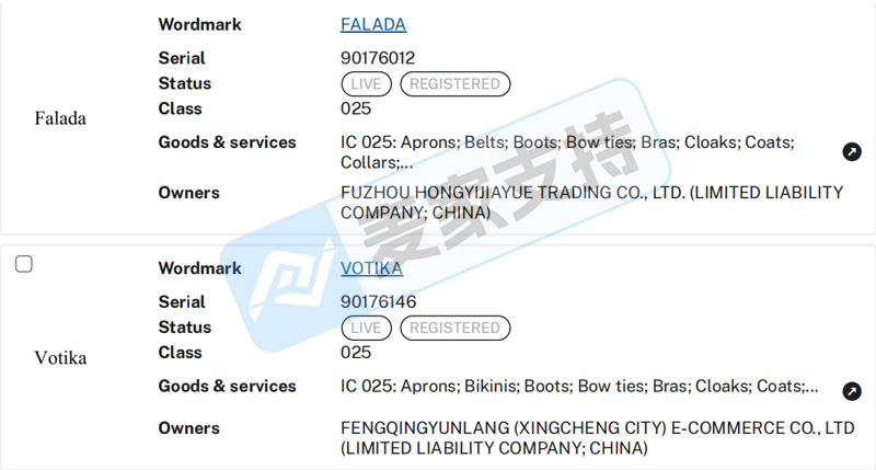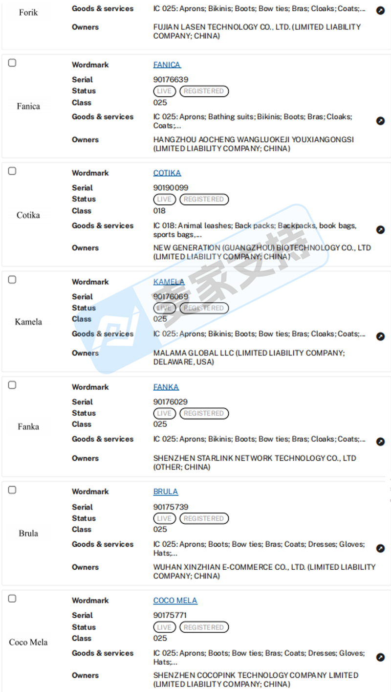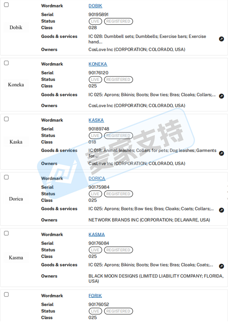 本案是YoungZeal代理CosLove Inc.发起的商标维权案件,CosLove在美国共注册有Koneka、Kaska、Kasma、Kamela、Fanica、Falada、Fanka、Forik、Brula、Coco Mela、Cotika、Votika、Dobik以及Dorica等14个商标在第18、25以及28大类,涵盖动物牵引带、服饰以及健身用品等多个类目。