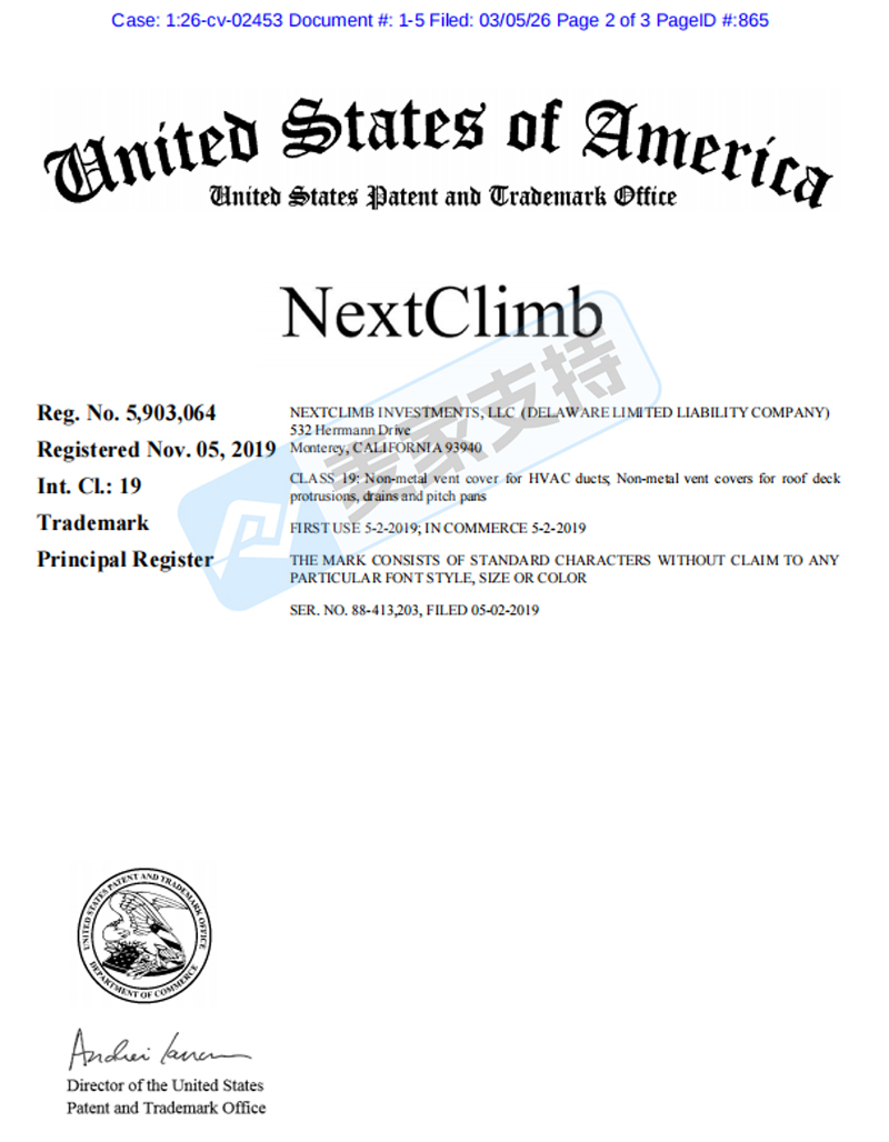 本案是Youngzeal LLP代理NextClimb Investments LLC发起的商标维权案件,涉案商标Nextclimb注册在第19大类,商标号为:5903064,涵盖用于暖通空调风道的非金属通风盖、屋顶平台突出部的非金属通风盖以及排水管和沥青罐类目,于2019年11月5日获得美国商标认证。本案共起诉了106名未经授权使用其商标的跨境商店的侵权行为,目前该案件处于前期立案阶段,暂未获批TRO临时限制令,涉案卖家需尽快排查并下架高危链接,做好应对措施!