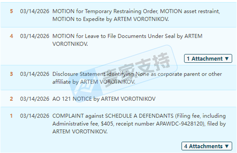 本次案件由Keith律所联合Ference律所在宾夕法尼亚州发起,聚焦俄罗斯自由设计师Artem Vorotnikov在美国注册的5个版权作品,针对未经授权使用行为批量起诉400名跨境卖家,目前案件处于前期立案阶段,后续将快速推进,高危卖家需立即行动!立即全面排查所有产品及Listing,下架所有涉及涉案5个版权作品链接、素材,排查隐性侵权,从源头规避TRO冻结。