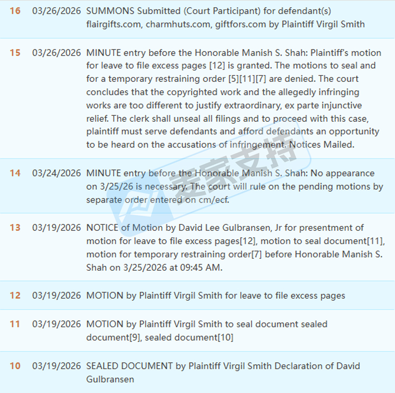 26年3月19日,David律所代表Virgil Smith向法院递交了TRO临时限制令申请,意图迅速冻结涉案账户资金。然而,法院在仔细审查后认为,原告的版权作品与被指控侵权的作品差异过大,不足以支持采取特殊的单方禁令救济措施。最终,于3月26日驳回了原告的TRO诉求,并要求解封所有文件。同时,法院明确规定必须向被告送达诉讼文书,给予被告就侵权指控进行申辩的机会。