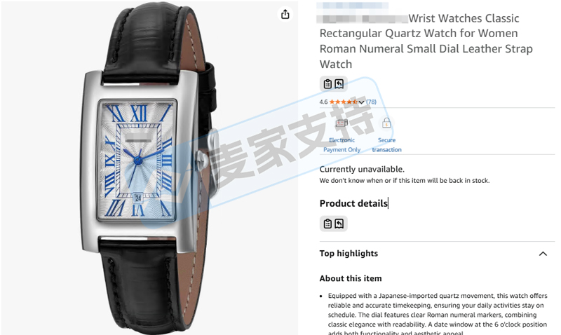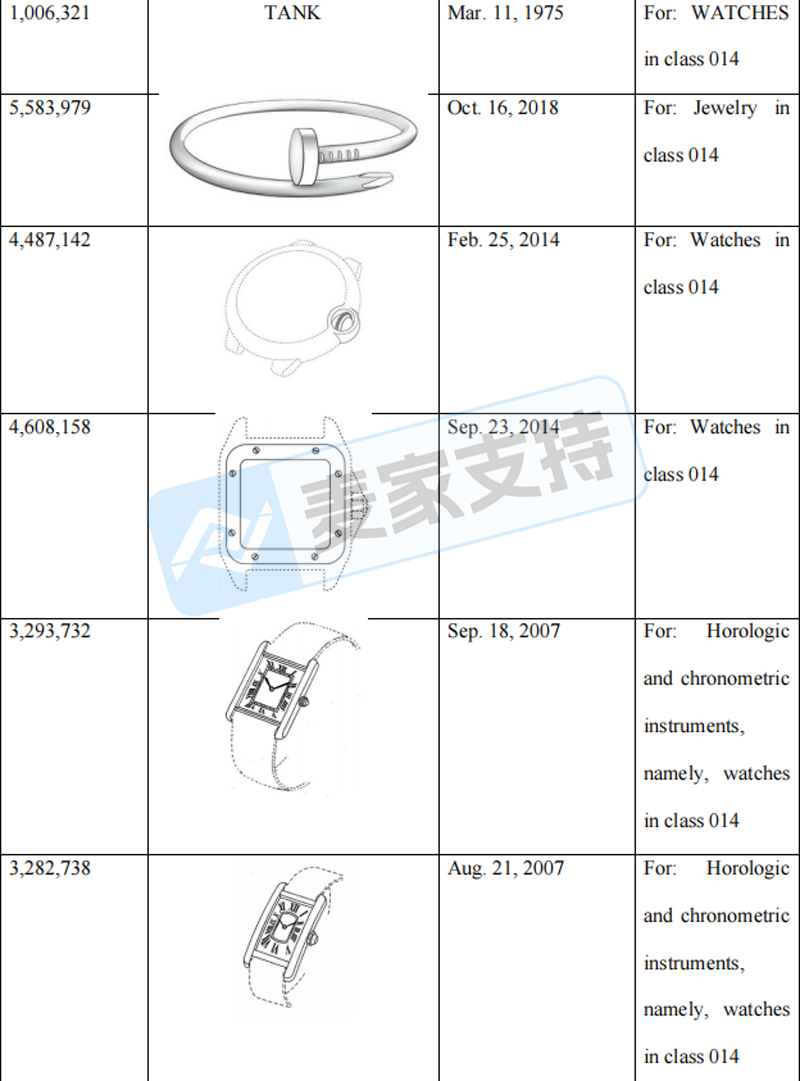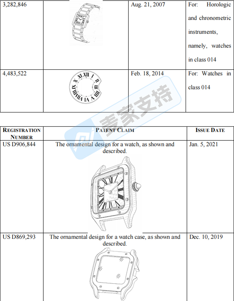与既往维权案件不同的是,本次Cartier卡地亚维权,除了其Cartier注册的系列文字商标外,还涵盖了多个表盘设计以及表带设计的图形商标以及专利号为:D906844、D869293的表盘外观专利设计,下证时间最早可追溯到2007年,因此表类卖家需注意排查,并规避侵权风险!如果已经不幸收到TRO冻结通知的卖家可联系我们获取解决方案,避免案件缺席后,损失进一步扩大!