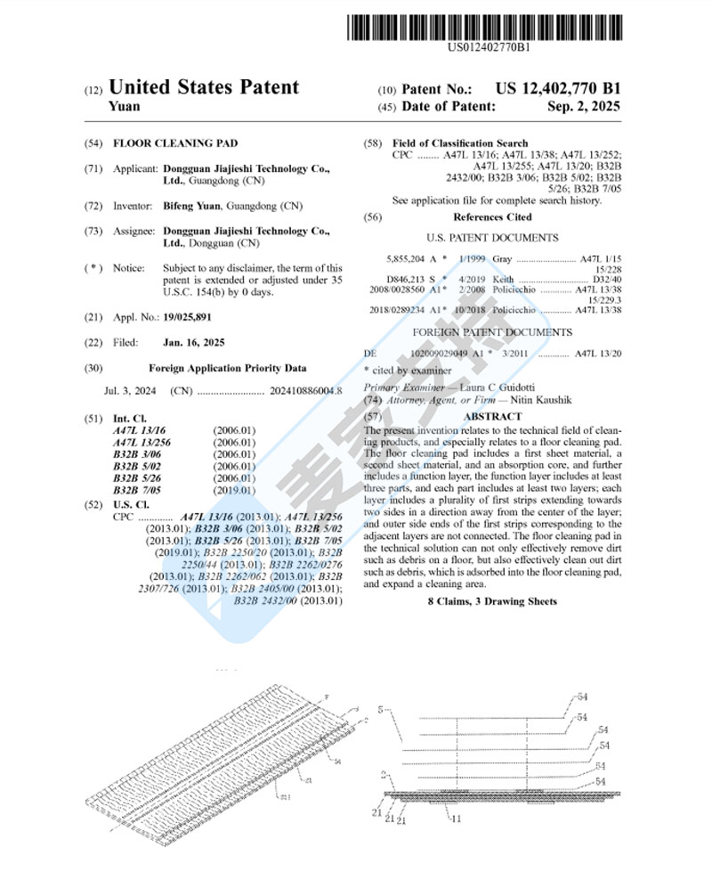 Dongguan Jiajieshi Technology Co., Ltd. 是一家深耕清洁产品领域的中国企业,专注于地板清洁垫、清洁用品及其他清洁溶液的研发与生产。鉴于现有地板清洁产品存在的诸多不足,如污垢易隐藏在多层材料及折叠边角处,难以清洁,导致产品易脏、无法完成大面积清洁且使用寿命有限的痛点,Dongguan Jiajieshi成功研发出一种创新型地板清洁垫,包含第一片材、第二片材、吸水芯及功能层,功能层分清洁、吸尘、吸水三个区域,各区域设计巧妙,能有效去除地板污垢,还能清除自身吸附的污垢,扩大清洁面积,显著提升了产品的实用性与耐用性,为地板清洁领域带来了新的解决方案。地板清洁垫在提供有效的清洁同时最小化损坏地板和其他硬表面的风险。每个产品采用高质量材料制造,旨在防止刮伤或其他对各种坚硬表面的伤害。