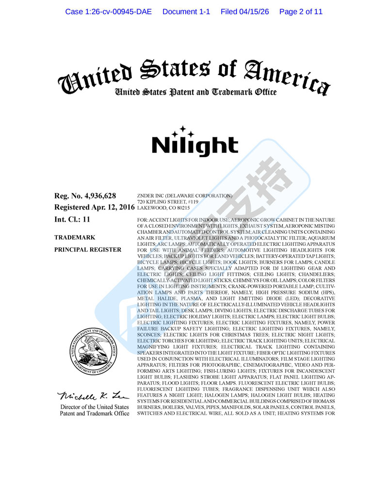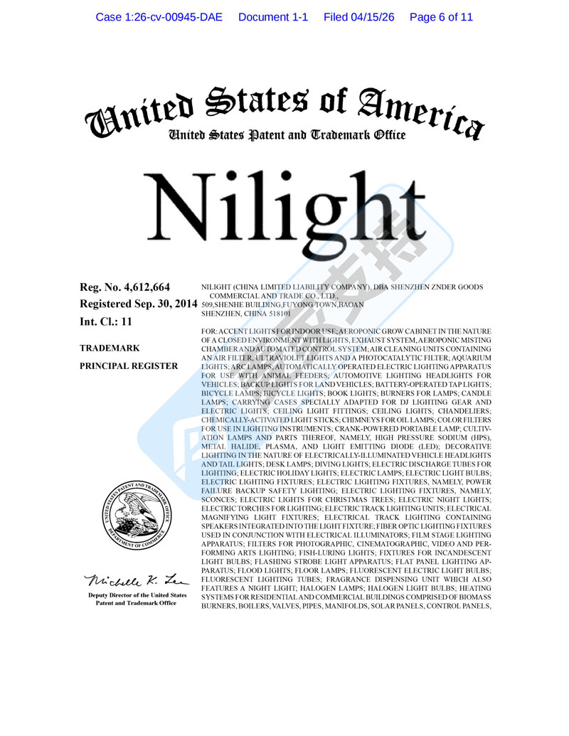 本案是HK Changsheng Ltd委托Tatonetti律所在美国德克萨斯州西区联邦地区法院提起的商标维权案,针对其持有的3项美国注册商标,未经授权在电商平台使用NILIGHT商标进行销售的侵权行为发起,向法院递交请求永久禁令、三倍损害赔偿、销毁侵权产品、律师费及法定赔偿等。
