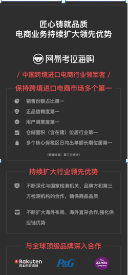 作为中国跨境零售电商市场的领军者,成立仅2年多的时间的网易考拉海购已经在国内消费升级市场树立了极好的市场口碑,值得信赖的正品货源、极具惊喜的价格体验以及超出预期的服务体验已成为网易考拉海购极具标识性的标签,为消费者、品牌商及第三方所认可。在2015-16年的快速发展基础上,网易考拉海购继续加大了在品牌供应链、仓储物流运营以及市场推广能力等诸多方面的全面布局和升级,谋求进一步扩大领先优势。