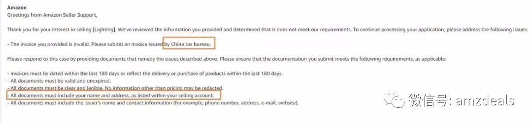 3、提交收据或其他发票以外资料是行不通的,不要以为亚马逊审核人员看不懂,明确规定中国税务局开具的发票才行。