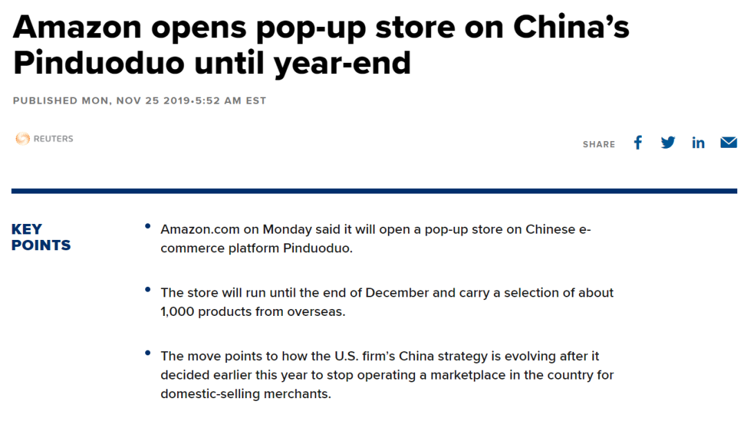 据路透社报道,亚马逊于本周一表示其将在中国电商平台拼多多上开设一家"快闪店(pop-up store)",双方的合作将持续到今年12月底,该"快闪店"将提供精选的千余种海外正品,这些产品价格低廉,购买方便。
