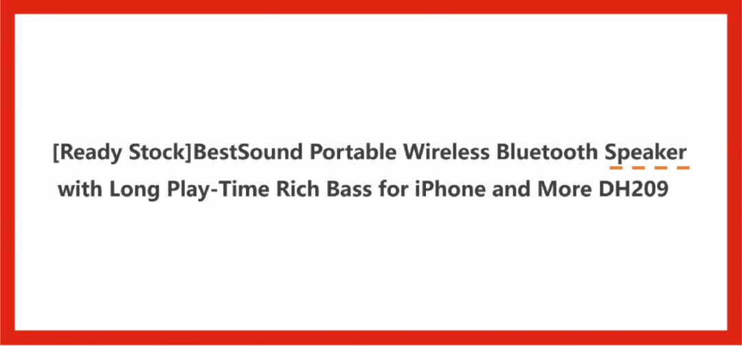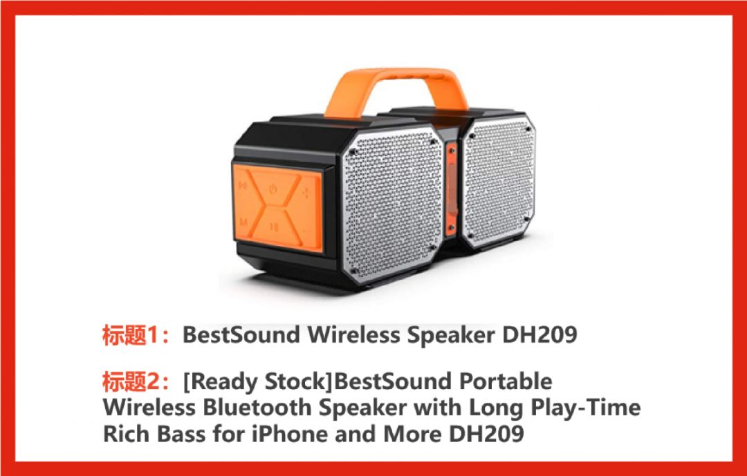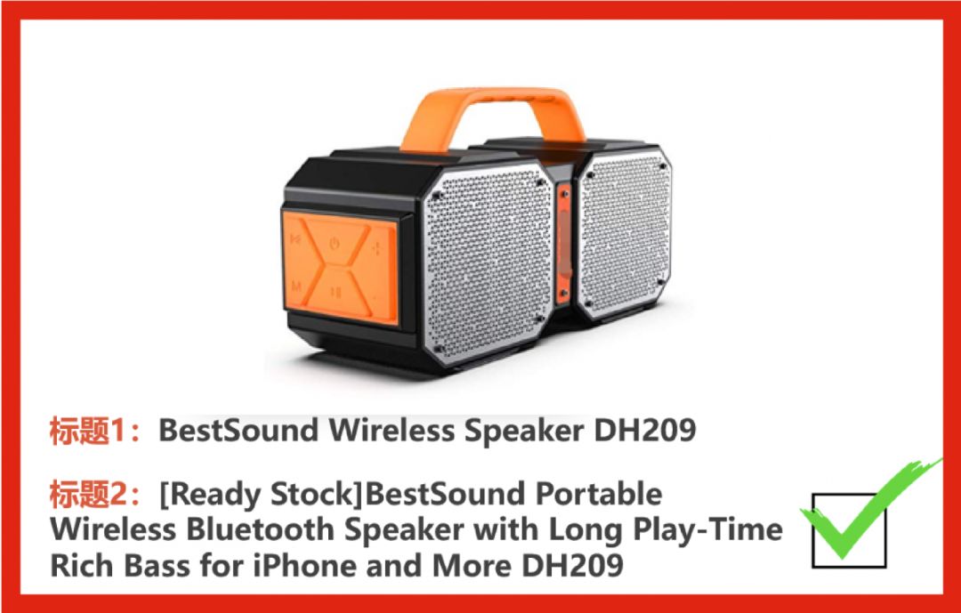 我们先用一个例子来看优质标题和劣质标题的区别:为一款无线扬声器创建两个Listing,假设两个Listing的价格、图片、描述完全一样,唯一区别是使用了不同的标题。标题①为“BestSound Wireless Speaker DH209”,标题②为“[Ready Stock]BestSound Portable Wireless Bluetooth Speaker with Long Play-Time Rich Bass for iPhone and More DH209”,那么大家认为这两个标题,哪一个更吸睛?