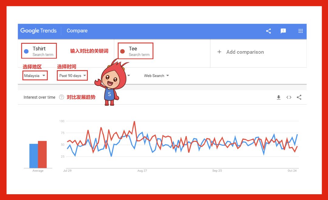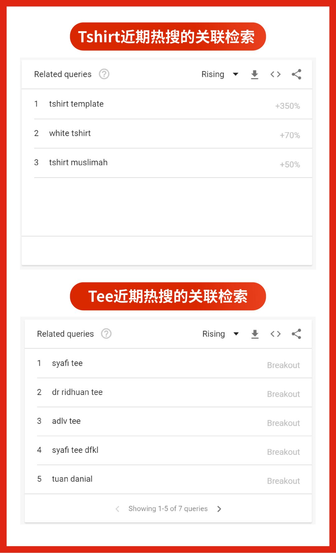 别纠结,谷歌趋势来帮你!谷歌趋势(网址为https://trends.google.com/)能够帮助卖家查询该关键词在该地区的谷歌搜索引擎的搜索热度。例如卖家想在Shopee马来西亚站销售T恤,想知道Tshirt和Tee哪一个在马来西亚热搜程度更高,就可以在谷歌趋势中选择地区、时间,输入两个关键词后即可对比查看数据。如图所示,从近3个月的整体情况来说,Tshirt和Tee的热搜程度相差不大,Tee的平均搜索量略高于Tshrit,但蓝色线(Tshirt)有微小的上升趋势。