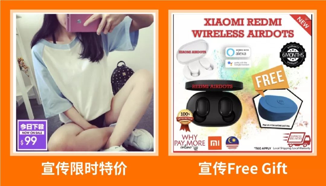 卖家在副图中还可以宣传营销信息,例如左图中宣传这款商品在限定期限内做特价,有效促进买家购买;右图中宣传赠品,充分“诱惑”买家下单。