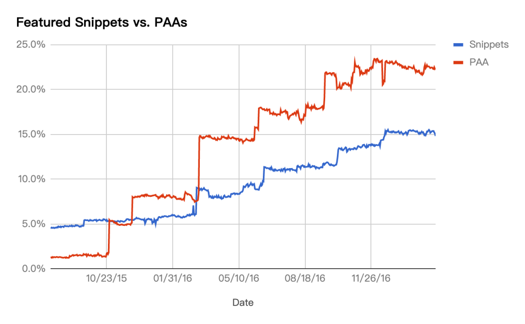 我们来看一组这样的数据,这个是PAA历史以来的增长数据,可以看得出,PAA的增长速度比Feature Snippets还快。