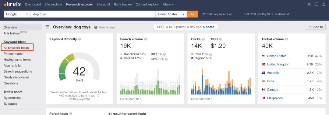 估计很多人不知道有什么词是会有PAA的,所以这里给大家介绍下Ahrefs的Keyword Explorer的功能。
