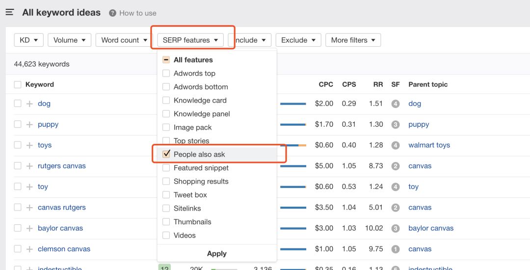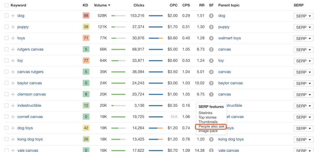 进入到关键词列表页之后,选择SERP Features,找到“People Also Ask”