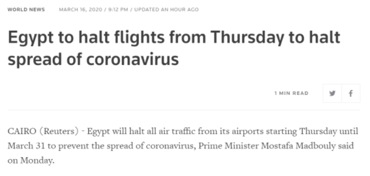 路透社及《今日埃及》等多家埃及媒体消息,埃及总理马德布利周一宣布,出于防控新冠病毒肺炎需要,埃及将于3.19-3.31日期间境内所有机场停飞所有航班。