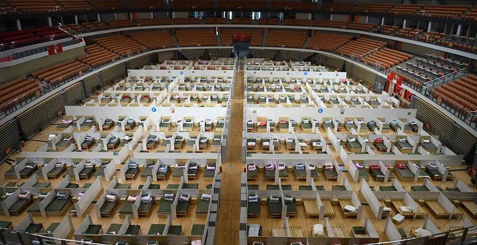 就是这么简陋的设施也只能提供250个床位,对比一下下图我们的武汉体育中心方舱医院(1000个床位),只能感叹,这就是招待所和星级酒店的差距啊。